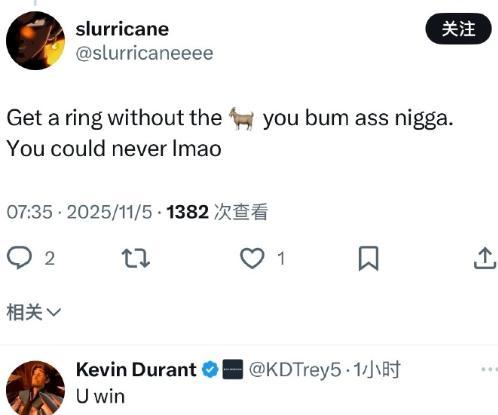 11月5日,也许是火箭最近赢球,杜兰特难得放松,有时间继续和球迷互喷垃圾话,其中有一个球迷说:离开山羊(代指库里),你有本事拿个冠军,废物,你永远做不到!